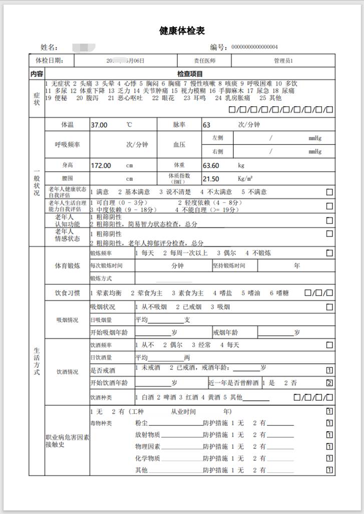 支持智能總檢評價、批量打印健康體檢報(bào)告,支持職業(yè)病/學(xué)生體檢,支持微信查看電子健康體檢報(bào)告